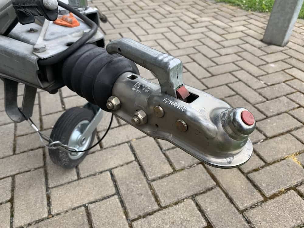 An der Deichsel ist zwar noch eine herkömmliche Anhängerkupplung ( keine Antischlingerkupplung ) verbaut, die montierte Kupplung ist dafür aber noch im hervorragenden Zustand und das Stützrad wurde offenbar auch schon gegen ein Neues ausgetauscht.